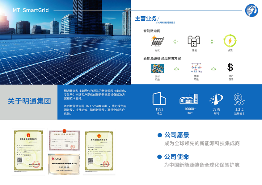 在全球新能源轉(zhuǎn)型、實(shí)現(xiàn)雙碳目標(biāo)的道路上,光伏新能源是當(dāng)之無(wú)愧的主力軍,明通裝備科技集團(tuán)一直以來(lái)也始終緊跟國(guó)家的步伐,致力于光伏新能源的發(fā)展。經(jīng)過(guò)多年的光伏行業(yè)深耕,明通積累了豐富的經(jīng)驗(yàn),并成功推出了智能微電網(wǎng)成套設(shè)備解決方案(MT SmartGrid),旨在為客戶解決光儲(chǔ)充用電問(wèn)題。